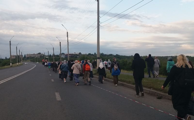 Насколько быстро шли участники хода, читателям, возможно, сложно представить. От этого и растянулась колонна почти на километр. Волонтерам приходилось немного подгонять отстающих, а тех, кто не мог ускорить шаг, на время рассаживали по машинам - паломников сопровождали автоволонтеры.