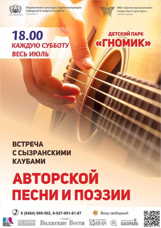 В субботу, 1 июля всех гостей парка «Гномик» ждет вечер авторской песни. В этот вечер в парке прозвучат всем известные и любимые мелодии под аккомпанемент самого лирического и проникновенного инструмента - шестиструнной гитары. Бардовские песни, песни под гитару – негромкие, искренние, идущие из самых сокровенных глубин человеческой души. Для поклонников бардовской песни в них есть удивительно добрая сила. Вечер авторской песни пройдет на открытой площадке парка «Гномик» в субботу в 18:00. Напомним, это будет далеко не первый опыт концерта бардовской песни в Сызрани: перед горожанами ранее выступали известные в музыкальных и общественных кругах исполнители: Владимир Варламов, Виктор Железнов, участники клуба самодеятельной песни «Подснежник» под руководством Елены Гало. Кто выступит перед сызранцами в эту субботу - организаторы пока не сообщают.