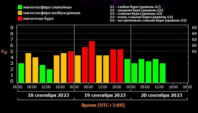 Прогноз на магнитную бурю 19 сентября подтвердился, причем событие оказалось заметно сильнее ожидавшегося. Первые возмущения магнитного поля были зарегистрированы еще днём ранее, в понедельник, а максимальные индексы 19 сентября достигли значений Kp=6,67 (при максимуме 9). «Сейчас магнитное поле Земли стабилизировалось. Ближайшие дни, как минимум до выходных, геомагнитные индексы должны остаться в зеленой зоне. При этом возможен рост вспышечной активности, но даже в случае сильных вспышек они не смогут оказать влияние на Землю до конца недели. В целом, высокая мощность бури стала довольно неожиданной», - отметили в Лаборатории Солнца и рассказали о непроверенных пока сообщениях о полярных сияниях.