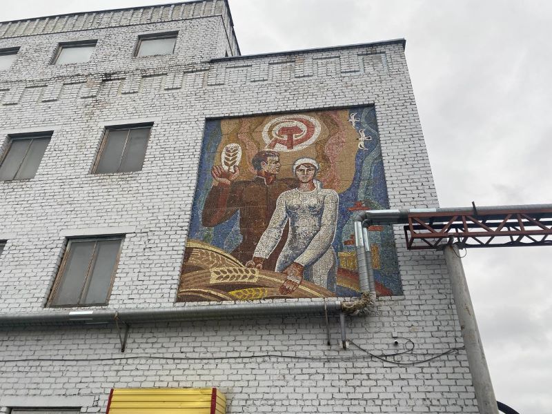На заводских зданиях и внутри цехов красуются советские мозаики и рисунки, посвященные труду и хлебу. Закрашивать их не стали. Ценно.