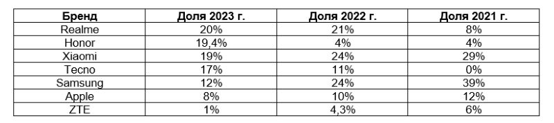В 2022 году лидерство делили между собой бренды Samsung (24%) и Xiaomi (24%), на третьем месте был Realme (21%), на четвертом Tecno (11%) и пятым шел Apple (10%). Похожая ситуация была и в 2021 году. Тогда рейтинг популярных брендов возглавлял Samsung с долей 39%, на втором месте располагался Xiaomi (29%), а замыкал тройку лидеров Apple (12%). Китайские бренды смартфонов Realme и ZTE тогда имели долю продаж 8% и 6% соответственно.