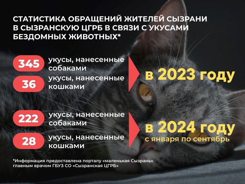 В 2024 году кошки тоже проявляли агрессию. Совсем не добрым оказался «кусь» для 28 жителей Сызрани. Однако, покусанных собаками опять же больше - 222 человека.