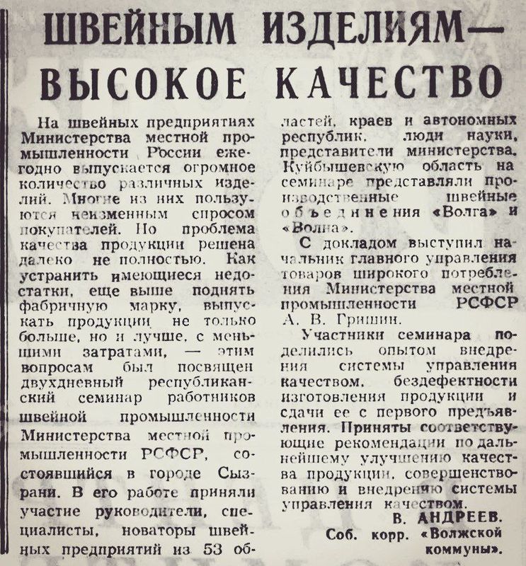 РСФСР именно в Сызрани проводят республиканский семинар. Как сообщала «Волжская коммуна», российских швейников волновало качество их работы -