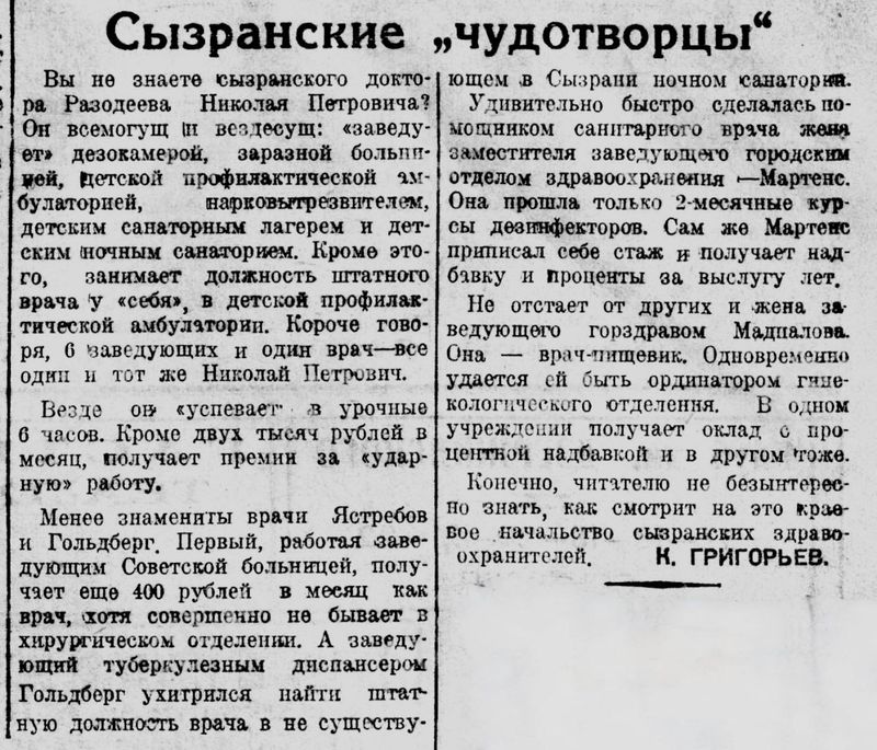 Медицинское руководство Сызрани поймали на неблаговидных поступках: врачи приписывали себе зарплаты, «трудоустраивались» в не существующие больницы, а своих жен пристраивали на теплые места с хорошим заработком. Коррупционные нарушения были выявлены милицией в далеком 1935 году, сообщение о «сызранских чудотворцах» опубликовано в газете «Волжская коммуна», о чем сообщает Telegram-канал «Вспомнить Сызрань». Масштабы мошенничества в медицине «всемогущих и вездесущих чудотворцев», действительно, впечатляют.