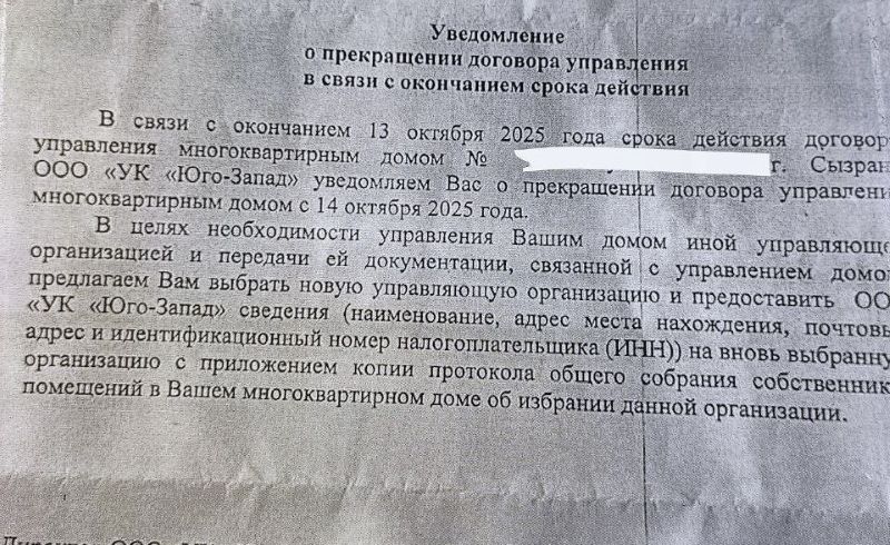 В Сызрани жители многоквартирных домов начали получать письма от управляющих компаний о завершении договора обслуживания. Сызранцам, у которых, например, 13 октября заканчивается договор, предлагают выбрать новую управляющую компанию в связи с расторжением договора с 14 октября. Вместе с тем горожан просят предоставить сведения о своем выборе для передачи новоизбранной УК документации, связанной с управлением домом. О своей ситуации в редакцию портала «маленькая Сызрань» сообщила жительница дома 27 на улице Физкультурников. «Поехала в офис своей УК, но там сказали, что обслуживать нас больше не будут. Нужно выбрать новую УК на общем собрании», рассказывает Наталья. Горожане строят догадки в чем причина. Жильцы пообщались с соседями, которым также прислали подобные письма.