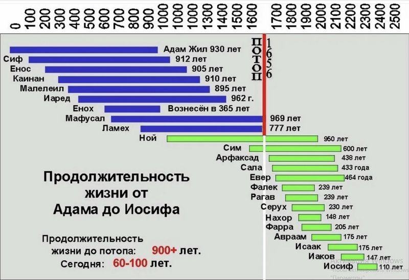Впрочем, история человечества знает и более интересные истории долгожительства. Во всяком случае, о них сообщает Библия. До Всемирного потопа, согласно Священному писанию, патриархи жили по 900 лет и более. Первый человек на Земле, Адам прожил 930 лет. Ной, построивший по заданию Господа ковчег, вообще прожил 960 лет. После потопа продолжительность жизни даже исключительных людей стала уменьшаться. Уменьшалась, уменьшалась - и уменьшилась до того что в начале XX века средняя продолжительность жизни составляла примерно 40 лет. Сейчас, по разным оценкам, она составляет от 60 лет и старше.