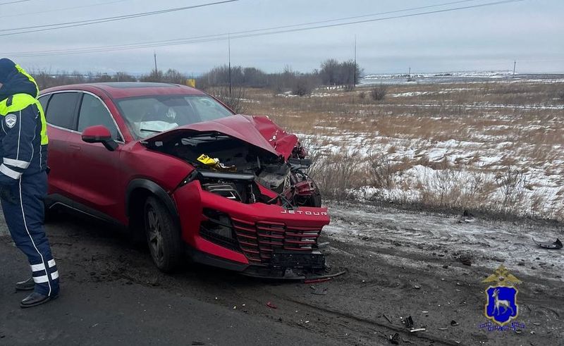 Полицейские из подбитой в ДТП машины бросились помогать раненым. Сегодня утром в Самарской области произошло смертельное ДТП - погибла женщина. По данным областного главка полиции, в 07:15 на 39 км автодороги «Самара - Пугачёв - Энгельс - Волгоград» столкнулись пять автомобилей. По предварительным данным сотрудников Госавтоинспекции, 40-летний водитель автомобиля Jetour не учёл погодные и дорожные условия, не выбрал безопасную скорость и дистанцию и допустил столкновение с автомобилем Lada Granta, который остановился на запрещающий знак светофора. В салоне Granta была пассажирка. От удара Granta столкнулась с впереди стоящей машиной - Chevrolet Lacetti. После этого отечественный легковой автомобиль выбросило на полосу встречного движения, где он лоб в лоб столкнулся с Renault Logan, который двигался на разрешающий сигнал светофора.