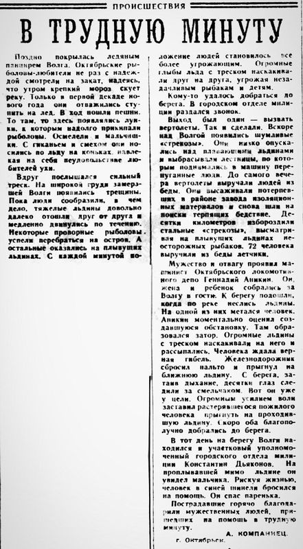 Сызранские вертолетчики спасли группу людей, оказавшуюся на льдине, неподалеку от Октябрьска: льдину, на которой были рыбаки и прибежавшие поиграть мальчишки, относило от берега. ЧП произошло в начале января 1966 года - память о нем сохранилась в газетной вырезке и публикации Telegram-канала «Вспомнить Сызрань». Как рассказал автор статьи, в тот год Волга поздно покрылась ледяным панцирем, и рыбаки смогли выбраться на некрепкий лед только в январе. Обосновались около острова, начали ловить рыбу; на лед выскочили мальчишки, увязавшиеся за рыбаками. И в этот момент люди услышали страшный треск.