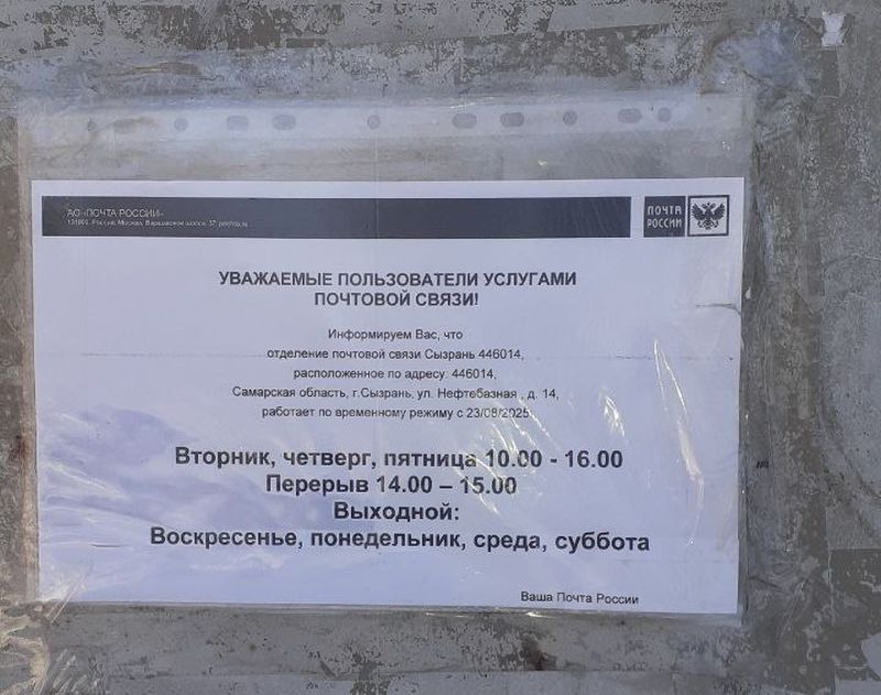 Двери некоторых почтовых отделений в Сызрани стабильно закрыты в те часы, когда работающий на 5-дневке человек может прийти и забрать заказные письма, посылки, купить газету, оплатить в кассе квитанции и т.д. В сети было опубликовано объявление на двери почтового отделения №14 на улице Нефтебазная. С 23 августа 2025 года отделение не работает по субботам и воскресеньям, а также по понедельникам и средам. Может быть, можно было бы как-то попасть в отделение вечером, в рабочие дни? - но нет, отделение в 16 часов уже закрывается. И по такому графику или похожему в городе работает еще несколько почтовых отделений - в частности, № 2(оно хотя бы в субботу открыто, но рабочий день так же короток), 22, 28.