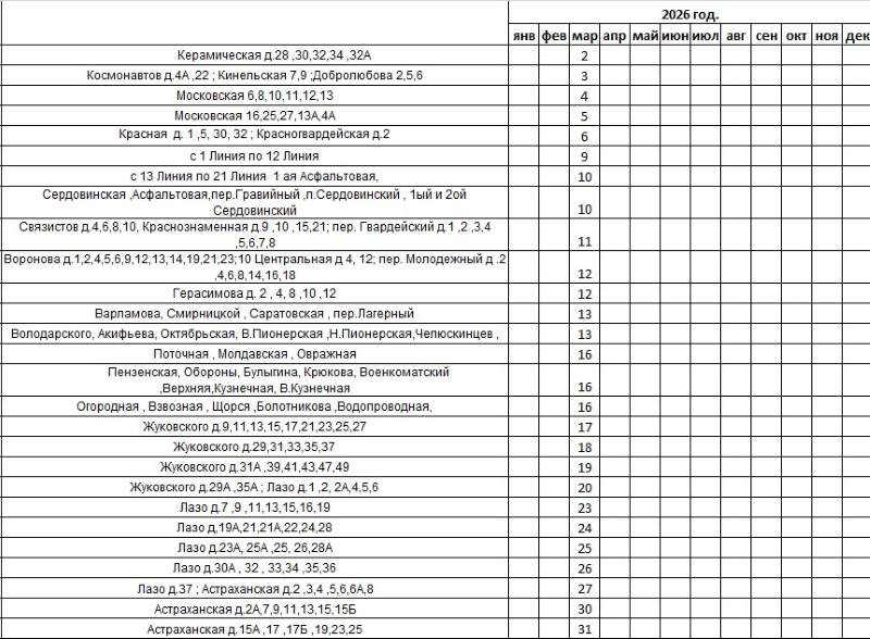 ОАО «Сызраньгаз» уведомляет горожан о дате проведения работ по техническому обслуживанию внутриквартирного (внутридомового) газового оборудования, назначенных на март 2026 года с 9-00 часов до 16-00 часов. В списке - сотни адресов, куда придут сотрудники организации. Горожанам также сообщают, что отказ в допуске представителя специализированной организации для выполнения работ по техническому обслуживанию газового оборудования является основанием для привлечения к административной ответственности в соответствии с п. 3 ст.9.23 Кодекса об административных правонарушениях в Российской Федерации. В случае отсутствия возможности предоставить доступ работникам ОАО «Сызраньгаз» в газифицированные помещения для проведения ежегодного технического обслуживания в рамках утвержденного графика необходимо сообщить об этом заранее и скорректировать график. Контактный телефон: 8(8464)98-30-53; 8-927-898-30-53 с 9:00 до 16:00 обед с 12:00 до 13:00