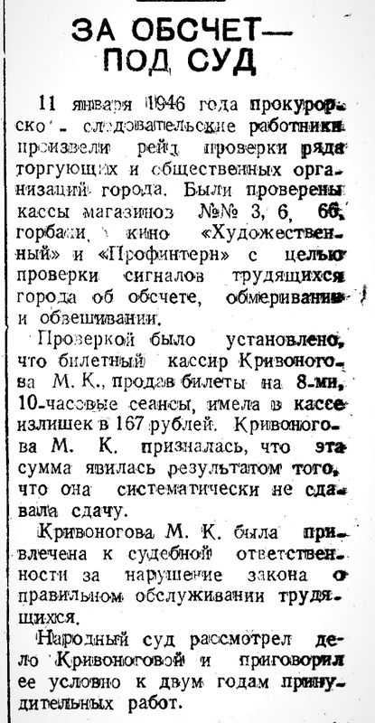 Было время, когда обсчеты покупателей в магазинах и организациях по оказанию услуг в Сызрани приняли настолько массовый характер, что заставили прокуроров и следователей провести проверку. Все случилось в далеком 1946 году, когда оплата наличкой была единственной формой оплаты в булочных, банях, кинотеатрах. Стражи порядка проверили несколько городских магазинов - сызранцы жаловались, что их обвешивают, обмеряют, обсчитывают. Были проверены кинотеатры «Художественный» и «Профинтерн» (оба эти кинотеатра располагались на улице Советской, в квартале от улицы Степана Разина до улицы Константина Федина. Позже «Профинтерн» получил новое имя - «Звезда». Сейчас оба здания уже не существуют). Также были проверены бани города.