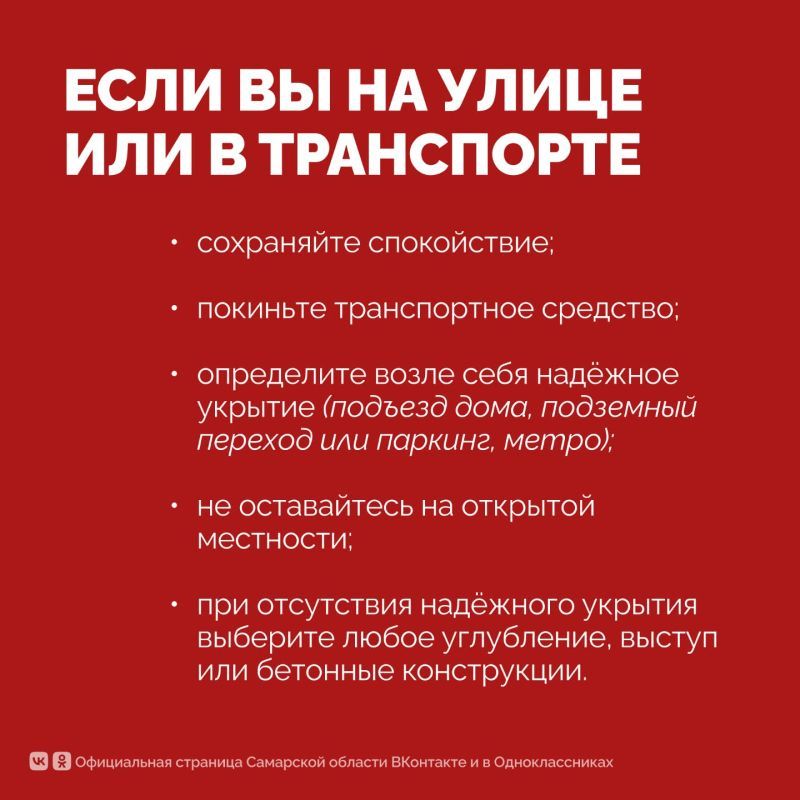 В Самарской области действует режим «Ракетная опасность». Жителям региона следует сохранять спокойствие, не поддаваться панике, пользоваться информацией только из официальных источников. Правительство Самарской области опубликовало памятку для жителей региона на случай ракетной опасности. Она соответствует той, что звучит в городах, если сработали сирены оповещения.